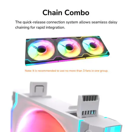 Система быстроразъемных соединений позволяет осуществлять бесшовное последовательное подключение для быстрой интеграции, гарантируя оптимальную эффективность воздушного потока: быстрая, простая сборка без инструментов, которая позволяет поддерживать охлаждение вашей установки без лишних хлопот. (Рекомендованная конфигурация из-за ваших ограничений с источниками питания - не более 3 вентиляторов)