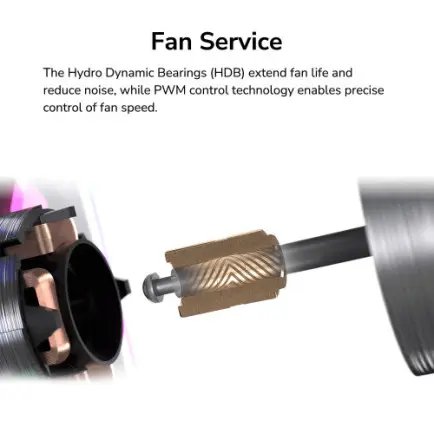 Гидродинамические подшипники (HDB) продлевают срок службы вентилятора и снижают уровень шума, а технология управления ШИМ обеспечивает точный контроль скорости вращения вентилятора.