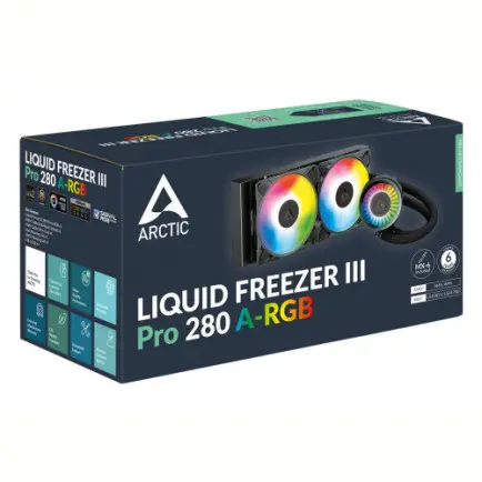 ARCTIC Liquid Freezer III Pro 280 A-RGB – жидкостная система охлаждения, сочетающая высокую эффективность с эстетической ARGB-подсветкой. Благодаря мощному водоблоку, оптимизированному радиатору и современным вентиляторам эта модель создана для пользователей, желающих получить не только надежное охлаждение, но и стильный акцент в своем ПК.