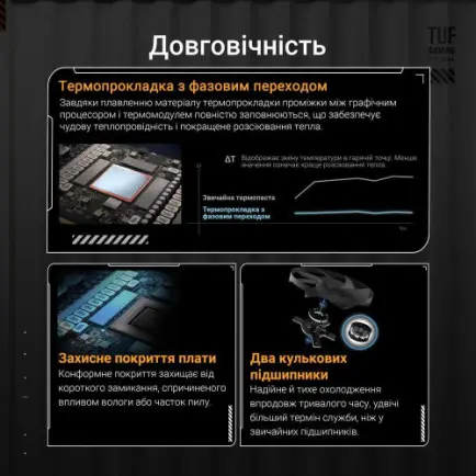 Передовой дизайн системы охлаждения включает в себя эксклюзивную технологию ASUS MaxContact, фазосдвигающую термопрокладку GPU и эффективные вентиляторы Axial-tech, обеспечивающие превосходные тепловые характеристики, оптимизированный воздушный поток и бесшумную работу, и все это в прочном и вентилируемом металлическом корпусе.