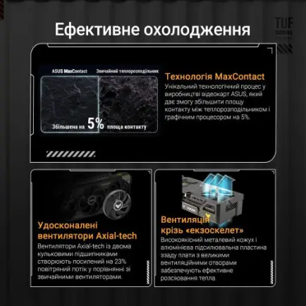 MaxContact - это специальный производственный процесс ASUS, который позволяет увеличить площадь поверхности теплораспределителя, расположенного на графическом процессоре, на 5% по сравнению с традиционной конструкцией. Это позволяет повысить температуру на 2°C в сочетании с обширным массивом радиаторов и мощными вентиляторами Axial-tech.