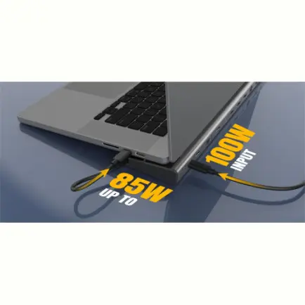 Кроме того, она имеет три порта USB 3.2 10 Гбит/с (1 USB-C и 2 Type-A) для подзарядки или подключения периферийных устройств, а также порт USB-C Power Delivery для подзарядки ноутбука и подключенных устройств с пропускной способностью до 85 Вт. Также имеется порт USB 2.0 для подключения беспроводной мыши или клавиатуры USB с уменьшенной задержкой.