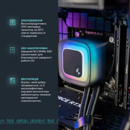 Геймер создает свое персонализированное, игровое пространство, где каждая деталь имеет особое значение. Печать ваших любимых героев на корпусе, комплектующие лучших производителей мира, множество вариантов подсветки – все это создаст невероятную атмосферу и еще больше погрузит вас в мир игры.