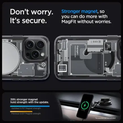 Прозора серія Ultra Hybrid Mag Safe поєднує в собі амортизуючий гнучкий бампер з жорсткою спинкою для забезпечення максимального захисту і кольорове магнітне кільце, розроблене спеціально для MagSafe Кришталево чиста задня частина, призначена для збереження первинного зовнішнього вигляду телефону без пожовтіння з плином часу Кути охороняються за допомогою Air Cushion Technology, яка повністю захищає від повсякденних ударів.Підтримує заряд через Magsafe завдяки магнітному кільцю.