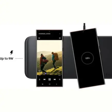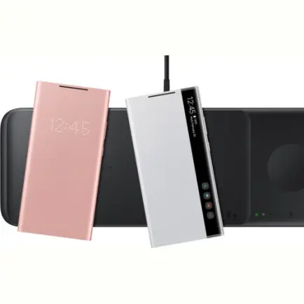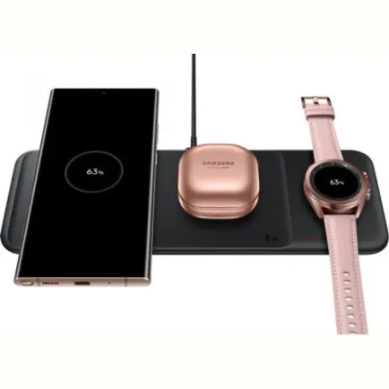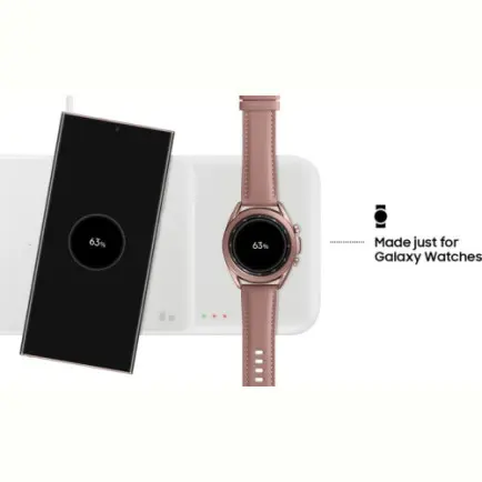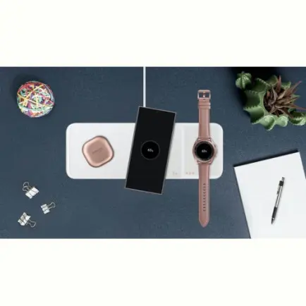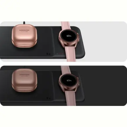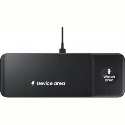 Щоб ваші Galaxy Watch завжди залишалися зарядженими, помістіть їх на спеціальну область із магнітним кріпленням праворуч. А зліва можна одночасно заряджати смартфон, бездротові навушники Galaxy Buds або інші сумісні пристрої.