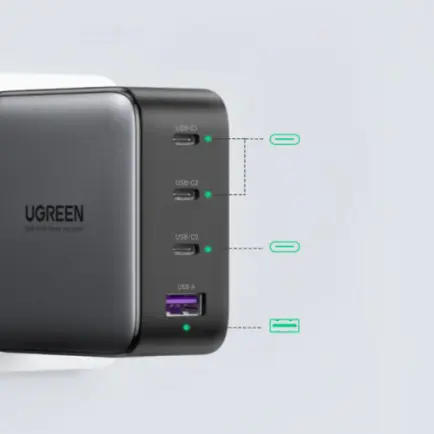 Багатопортовий зарядний пристрій Ugreen CD226 (40747) з загальною вихідною потужністю 100Вт оснащений чотирма портами – трьома USB-С та одним USB-А.