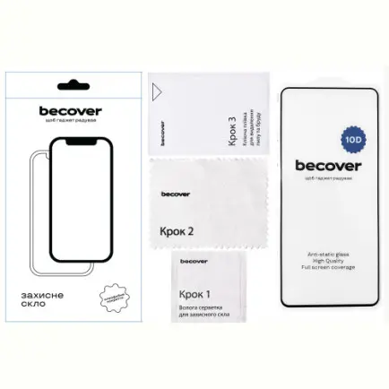 Повне Покриття: Скло 10D має закруглені краї, що дозволяє йому ідеально прилягати до екрану смартфона, забезпечуючи повний захист без проміжків.