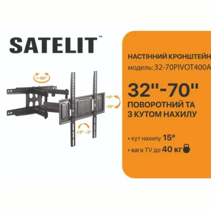 Кронштейн Satelit 32-70PIVOT400A з категорії універсальних консолей з похило-поворотним механізмом: кут нахилу в межах 15° і діапазон повороту по горизонталі 60°.