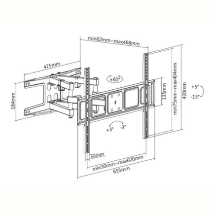 Модель кронштейна Satelit 32-70PIVOT400A дозволяє розміщувати екран на регульованій відстані від стіни від 62 до 468 мм.